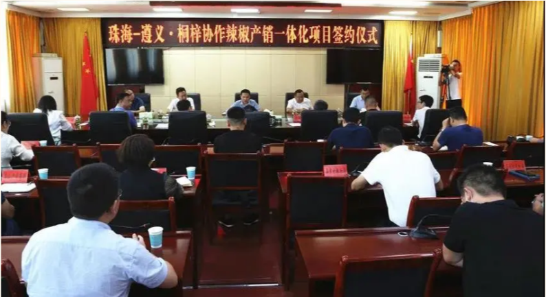 近日,“珠海-遵义· 桐梓协作辣椒产销一体化项目”签约仪式在桐梓县政府举行。桐梓县人民政府、珠海市菜篮子投资有限公司、辣妹子食品股份有限公司、遵义辣椒产业集团有限公司签订了四方合作协议,共同打造辣椒产销一体化产业。平博在线集团党委副书记刘国涛同志出席签约仪式。