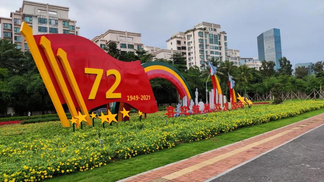 在中华人民共和国成立七十二周年来临之际,粤华园林公司精心筹备,用38万株缤纷绚烂的多彩时花和600多面鲜艳的五星红旗精巧地装扮着市属各大公园和珠海大道沿线,迎接“十一”国庆——这举国欢庆的日子,为珠海这座青春活力之都增添热闹喜庆的气氛。
